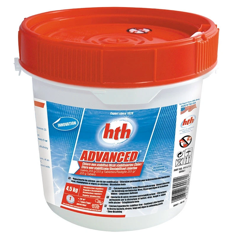 HTH Advanced est un chlore lent non stabilisĂ©. Il assure la dĂ©sinfection de l’eau d’une piscine sans ajouter de stabilisant.