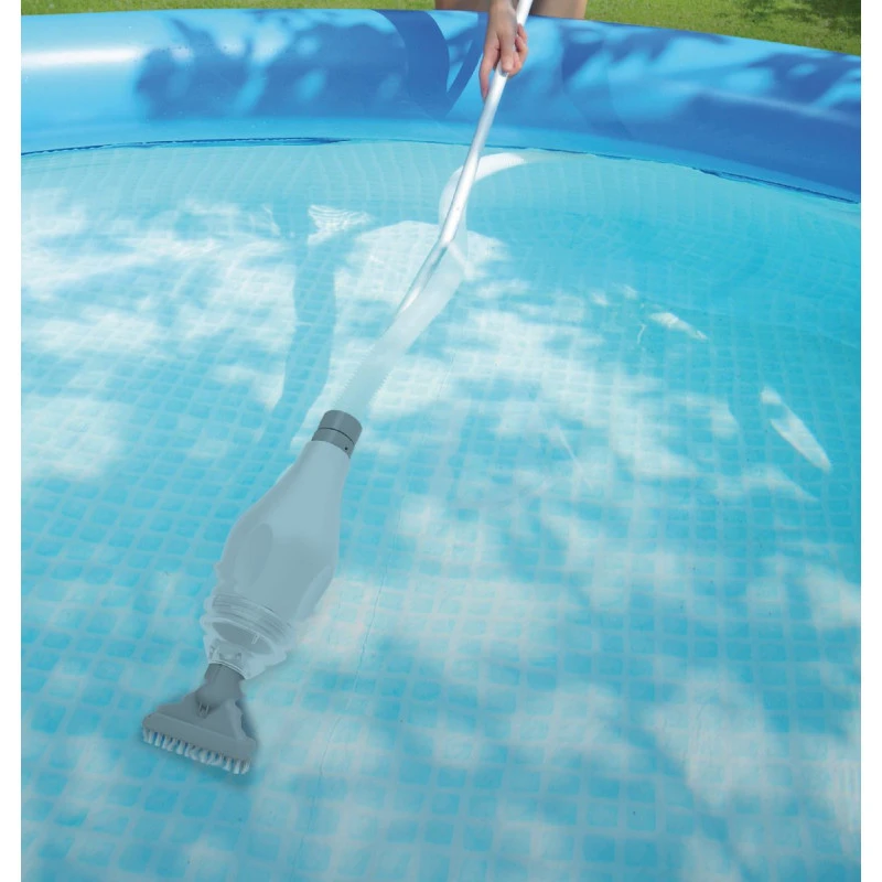 Cet aspirateur manuel est adapté aux piscines hors-sol ayant un diamètre compris entre 2,44 et 4,50m. Pour fonctionner, il suffit de le brancher sur une filtration avec débit minimum de 2m³/h.