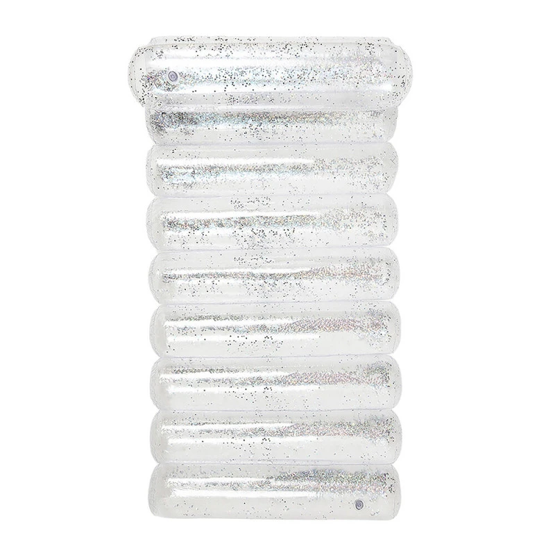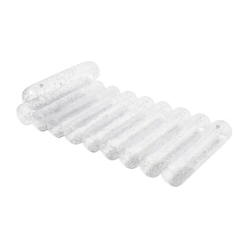 Matelas transparent composĂ©s de nombreux tubes avec des paillettes Ă l’intĂ©rieur. Avec lui Ă vos cĂ´tĂ©s vous aurez du style tout l’Ă©tĂ© dans votre piscine ou Ă la plage !
